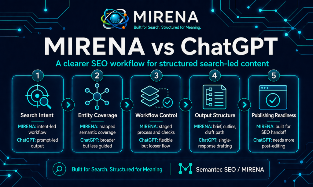 Now everyone can generate decent paragraphs. Everyone can imitate what is already in the SERP. When output becomes cheap, structure becomes the advantage. That is the gap MIRENA is designed to fill. The system is consistently framed around semantic SEO, entity salience, information gain, intent modeling, and internal link architecture rather than generic content generation.