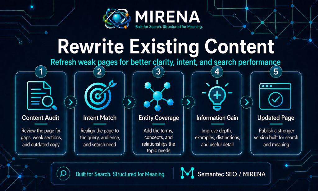 MIRENA also formats content with retrieval in mind: definition blocks, FAQ structures, comparison layouts, lists, tables, and other patterns that are easier for search systems to interpret.