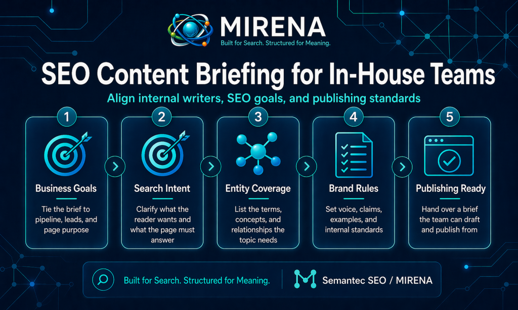 Once the right page exists, MIRENA can turn it into an entity led brief. That means the brief is not just a keyword list or outline. It tells the writer or team what to cover, what order to cover it in, which entities, what format best fits intent, what SERP features should be targeted, and where internal links should go.